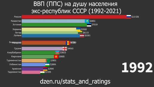 Как менялся ВВП (ППС) на душу населения экс-республик СССР с 1992 по 2021 год