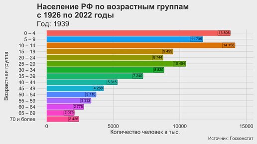 Население РФ по возрастным группам с 1926 по 2022 годы
