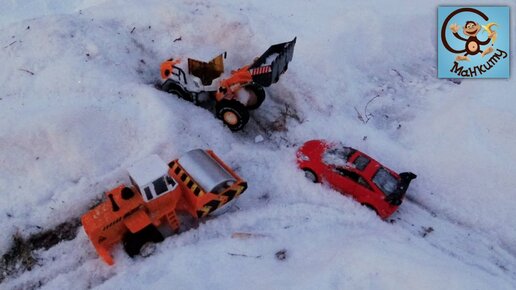 Машинки игрушки - Экскаватор, красная машинка и каток чистят снег