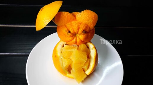 Муж показывает, как красиво можно подать фруктовую нарезку на праздничный стол. Такой мишка из апельсина понравится всем