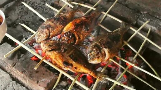 Дорадо на деревянной решетке гриль. Супер маринад.