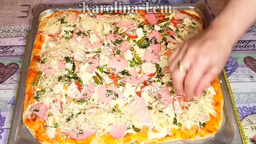Домашняя пицца из замороженных "Весенних овощей" с колбасой, томатами-черри и сливочным соусом; обалденно нежно