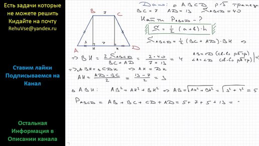 Геометрия Основания равнобедренной трапеции равны 7 и 13 а ее площадь равна 40 Найдите периметр трапеции