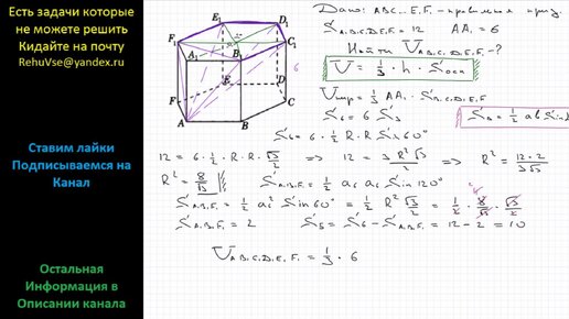 Геометрия Дана правильная шестиугольная призма ABCDEFA1B1C1D1E1F1 площадь основания которой равна 12 а боковое ребро равно 6 Найдите объем