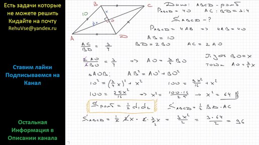 Геометрия Найдите площадь ромба, если его периметр равен 40 см, а диагонали относятся как 3 : 4