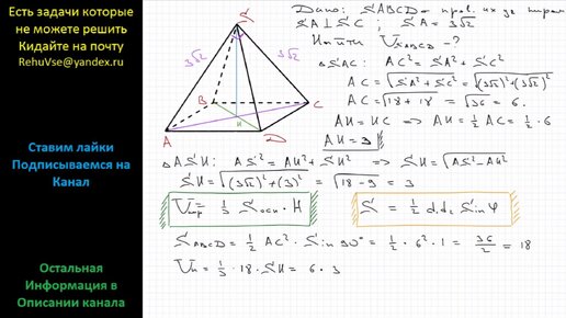 Геометрия Боковые ребра SA и SC правильной четырехугольной пирамиды SABCD взаимно перпендикулярны. SA = 3√2. Найти объем пирамиды