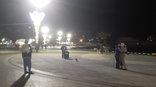Влюбленная пожилая пара танцует на набережной Ялты у моря