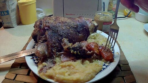 Айсбайн - свиная рулька запеченная в пиве с гороховым пюре и тушенной капустой
