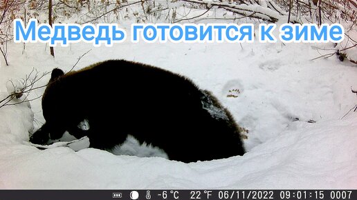 Медведь готовится к зимней спячке. Пришла зима, пора в берлогу.