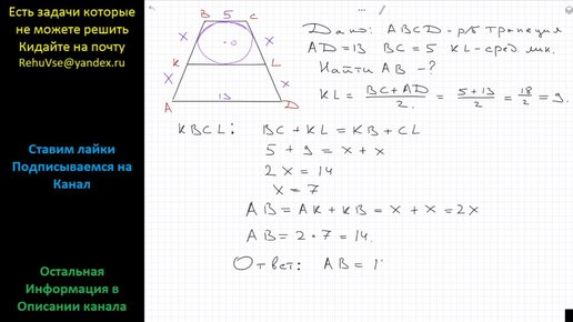 Геометрия В равнобедренной трапеции основания AD = 13, BC = 5, KL средняя линия. В трапецию KBCL можно вписать окружность. Найдите боковую
