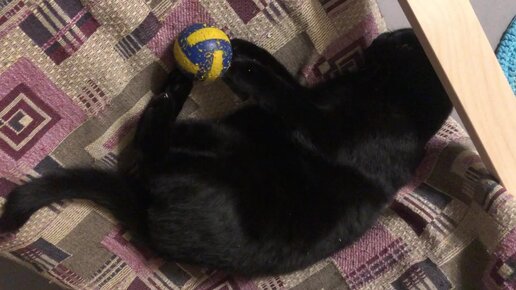 Черныш балуется с мячиком на кресле. Дачное безделье в морозный зимний день.