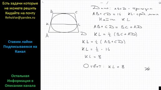 Геометрия В трапецию, сумма длин боковых сторон равна 16, вписана окружность. Найдите длину средней линии трапеции