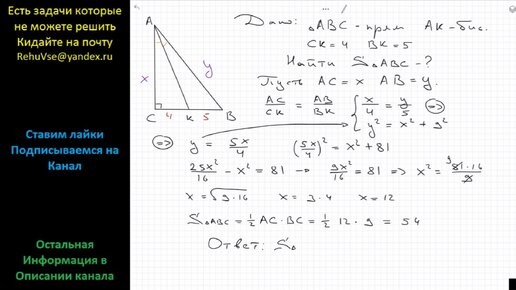 Геометрия В прямоугольном треугольнике биссектриса острого угла делит противоположный катет на отрезки длиной 4 и 5 см. Найти площадь