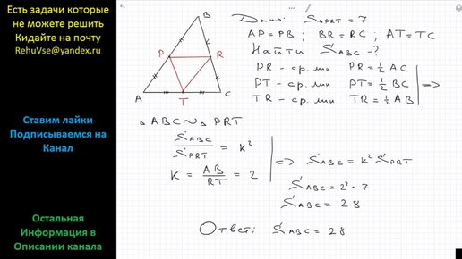 Геометрия Найдите площадь треугольника ABC, если площадь треугольника PRT равна 7, где P, R, T середины сторон треугольника ABC.