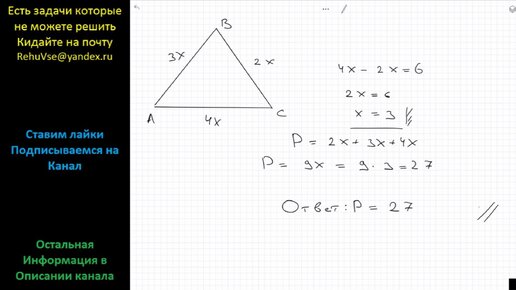 Геометрия Длины сторон треугольника относятся как 2:3:4. Чему равен периметр треугольника, если разность наибольшей и наименьшей сторон