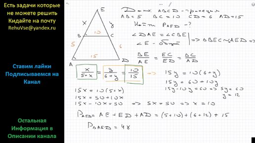 Геометрия Продолжение боковых сторон AB и CD в трапеции ABCD пересекаются в точке E Найдите периметр треугольника AED, если AB = 5, BC = 10