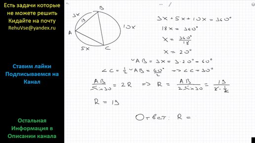 Геометрия Вершины треугольника делят описанную около него окружность на три дуги, длины которых относятся как 3 : 5 : 10. Найдите радиус