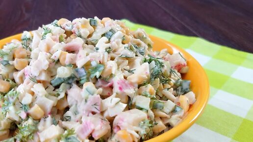 Салат из крабовых палочек с кукурузой и плавленым сырком.