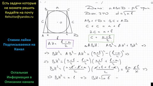 Геометрия Докажите, что диаметр окружности вписанной в равнобедренную трапецию есть среднее пропорциональное между ее основаниями