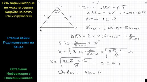 Геометрия Площадь равнобедренного треугольника равна 81√3. Угол, лежащий напротив основания, равен 120. Найдите длину боковой стороны