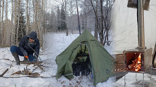 Зимний кемпинг в лесу. Палатка с печкой. Релакс под хруст снега