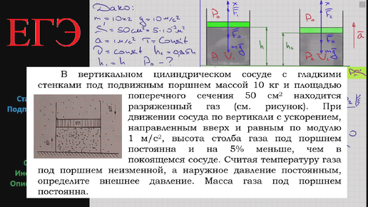 Физика В вертикальном цилиндрическом сосуде с гладкими стенками под подвижным поршнем массой 10 кг и площадью поперечного сечения 50 см2
