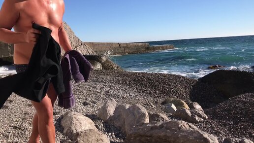 Блогер купается в зимнем море. Днём 20 декабря после морозной ночи было тепло и солнечно