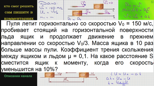 Физика Пуля летит горизонтально со скоростью V0 = 150 м/с, пробивает стоящий на горизонтальной поверхности льда ящик и продолжает движение