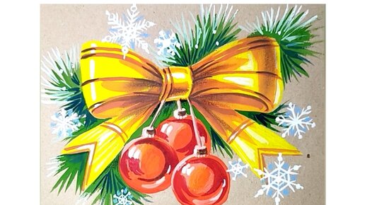 🎄😊🎄Жёлтый бант с красными шариками. Как нарисовать ёлочное украшение гуашью.