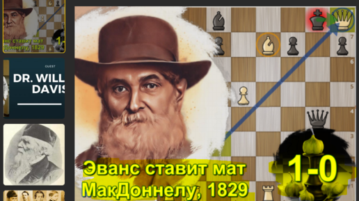 Триумф гамбита Эванса стартовал с этой игры: сам капитан Уильям Дэвис Эванс облапошил этим дебютом Александра Макдоннела в Лондоне, 1829