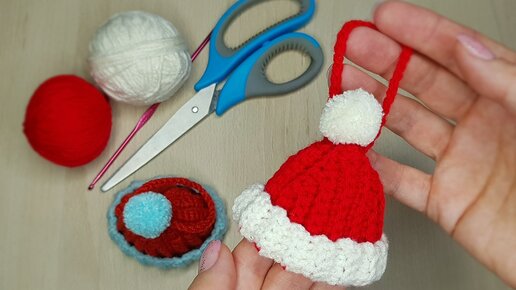 Миниатюрная шапочка Деда Мороза крючком. Игрушки на ёлку
