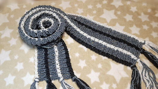 Вяжу крючком теплый трехцветный шарф с кистями, оригинальный прием вязки для толстой пряжи
