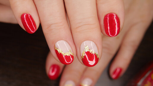 Новогодний дизайн ногтей в красно-золотых тонах обычным лаком
