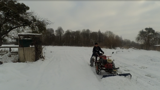 Расчищаю площадку от снега мотоблоком с адаптером.