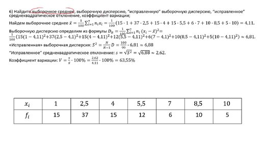 Нахождение выборочного среднего, выборочную дисперсии, исправленной дисперсию, исправленного с.к.о., коэффициента вариации (РЗ 9.6)