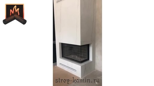 Дизайнерское оформление дровяной угловой топки Астов П2С 8457 белоснежным керамогранитом в коттедже под Тулой