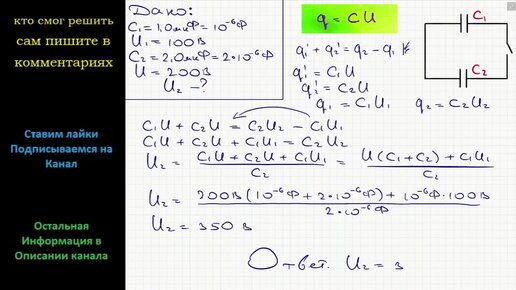 Физика Конденсатор емкостью C1 = 1,0 мкФ, заряженный до разности потенциалов U1 = 100 В, соединили с конденсатором емкости C2 = 2,0 мкФ
