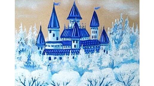 🌨️❄️🏰Голубой замок, нарисованный гуашью на крафтовой бумаге.❄️🌨️🏰