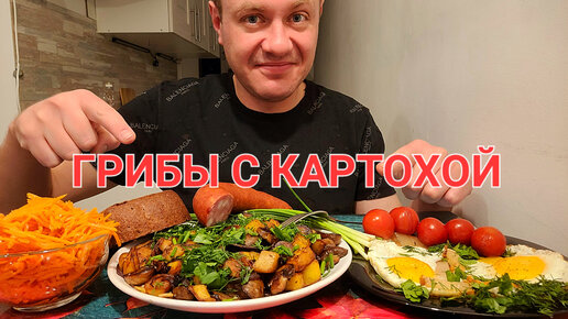 МУКБАНГ. ОБЖОР. ЖАРЕНЫЕ ГРИБЫ С КАРТОШКОЙ, КОЛБАСА КРАКОВСКАЯ, ЯИЧНИЦА НА САЛЕ.