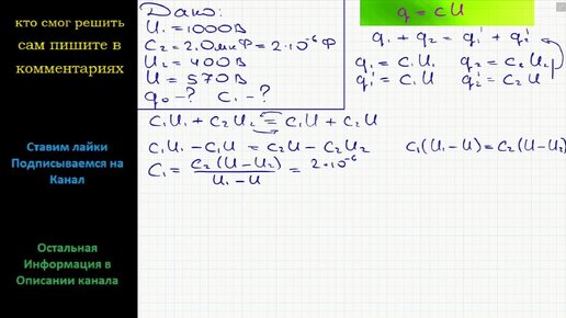 Физика Конденсатор неизвестной емкости с напряжением на обкладках U1 = 1000 В соединили параллельно с другим конденсатором емкостью C2 = 2,0