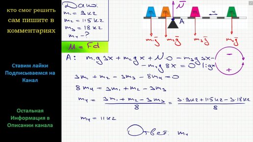 Физика Дан невесомый рычаг с двумя противовесами на каждой стороне. Массы противовесов m1 = 9 кг, m2 = 115 кг и m3 = 18 кг. Какова масса
