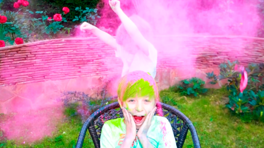 Тёма и Паша играют на улице с мыльными пузырями и красками Холли