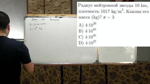 Радиус нейтронной звезды 10 км, плотность 10^17 кг/м3. Какова его масса?