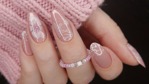 Нюдовый маникюр со снежинками обычным лаком. Зимний дизайн ногтей