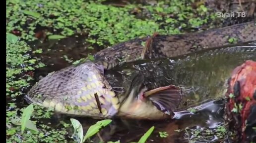 ЗМЕЯ ЗАГЛАТЫВАЕТ ОГРОМНОГО СОМА!!!