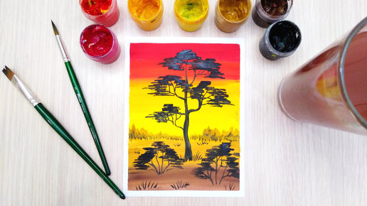 Силуэты сосны и кустов на закате. Рисование гуашью