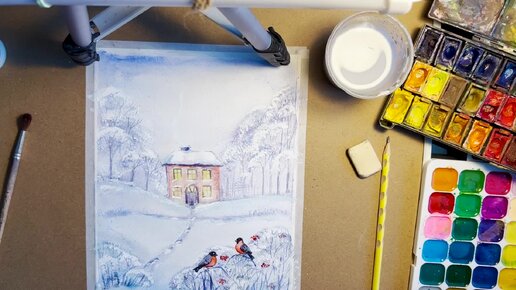 Зимний пейзаж, снегири на ветвях. Рисуем вместе. Акварель.