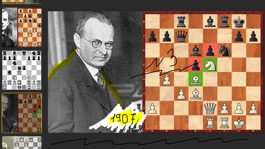 Нимцович на практике вскрывает секреты: покажу партию за белых с потрясающей победой. Черные (фон Шеве) явно увлеклись фланговой атакой, 1-0