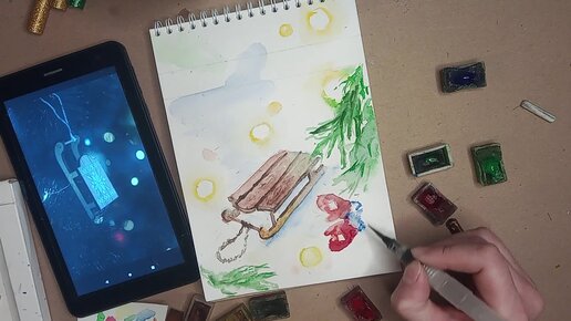 Новый год своими руками. Открытка акварелью с санками и рукавичками. Часть 2. Работа с цветом