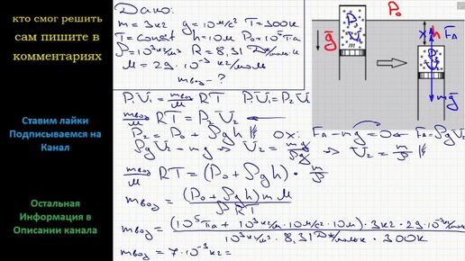 Физика Тонкостенный цилиндр с воздухом закрыт снизу поршнем массой m = 3 кг который может без трения перемещаться в цилиндре Цилиндр плавает